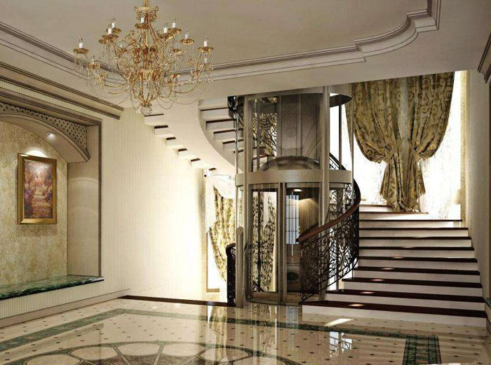 曳引家用電梯或別墅電梯:井道及地坑、轎廂、層站部分;主要部件:曳引系統、導向系統、門系統、轎廂、重量平衡系統、電器控制系統、安全保護系統,電氣方面的安全保護在電梯的各個運行環節都有,這種電梯同小區電梯相同。安靜平穩、價格經濟、乘坐舒適,方便殘疾人和老年人使用豪華高檔的家居電梯。